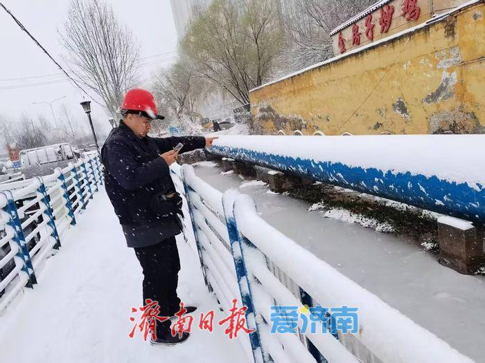 3月2日上午,济南开始飘起了雪花。在市中区杆南小区,记者看到三名身着工装的济南水务集团城南分公司工作人员正跪在雪地的路面上,仔细巡查供水管道,确保了供水设施在极端天气下的安全运行。